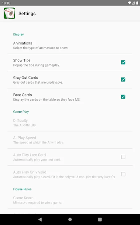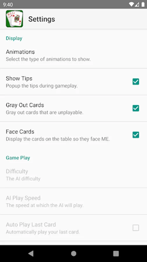 - Display options: Animations, Show Tips, Gray Out Cards, Face Cards