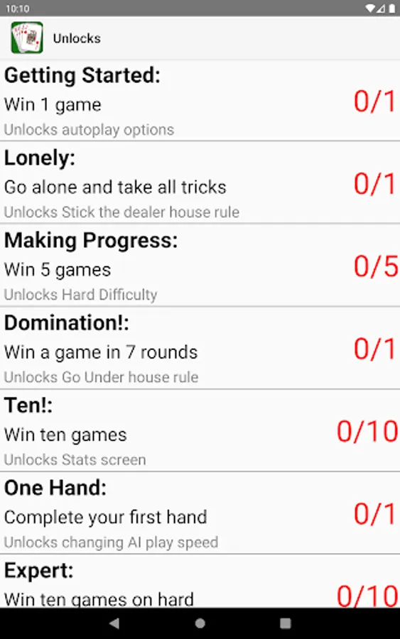 Play Euchre with challenging AI players, numerous settings, unlockables, and statistics! This app includes: