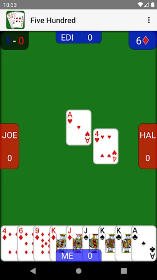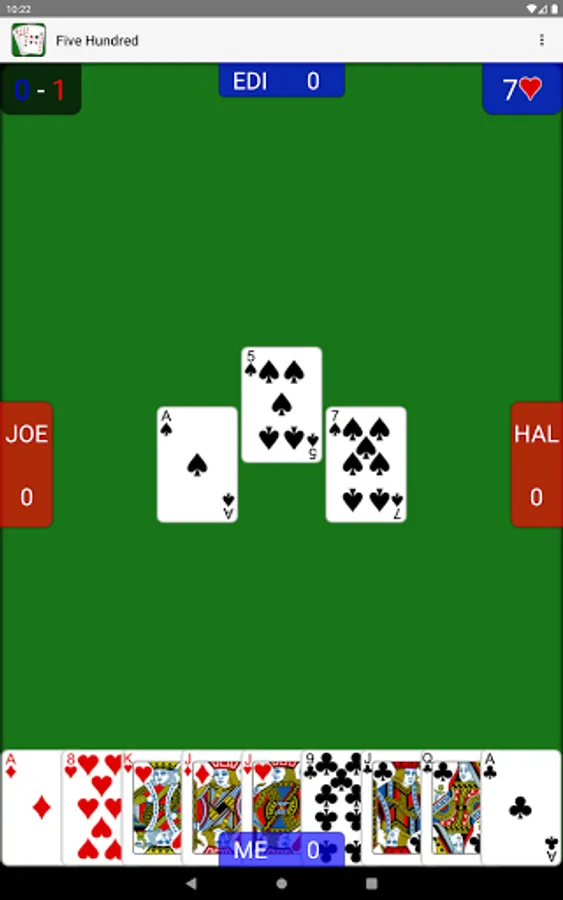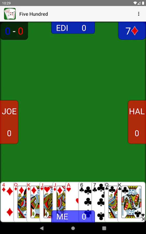 - Single player 500 against three AI players with changeable difficulty settings