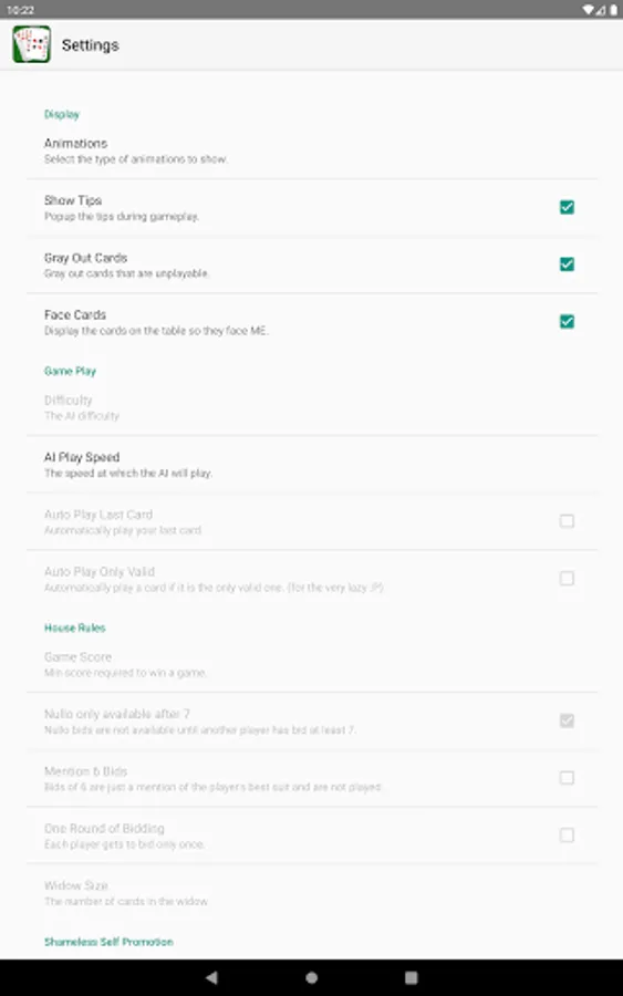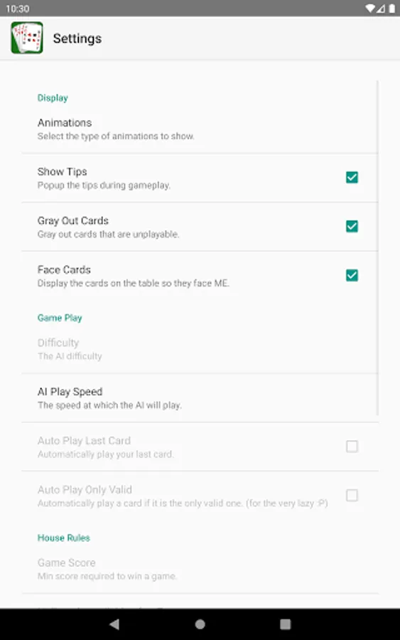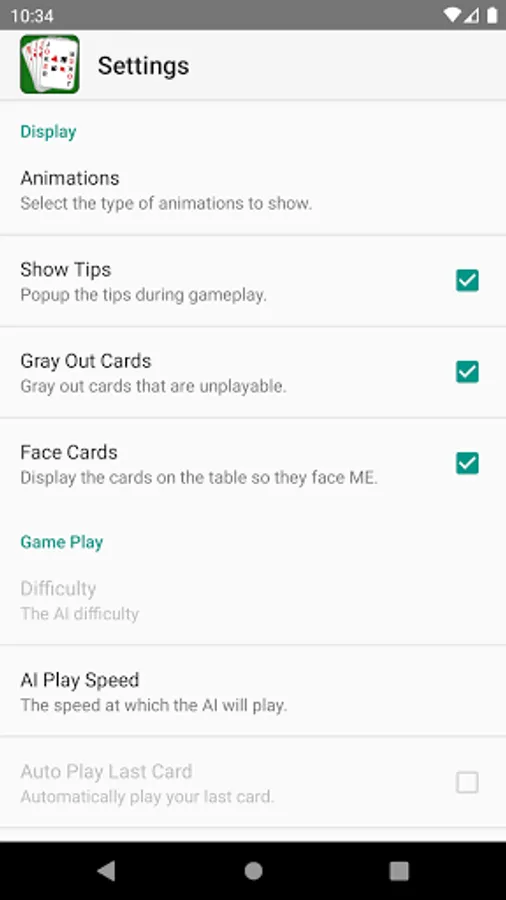 - Display options: Animations, Show Tips, Gray Out Cards, Face Cards