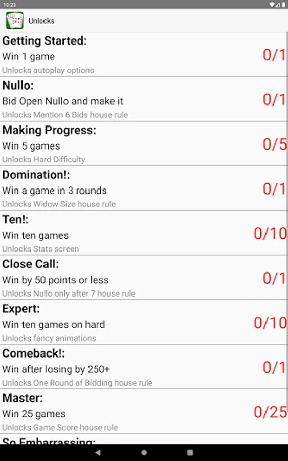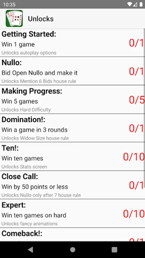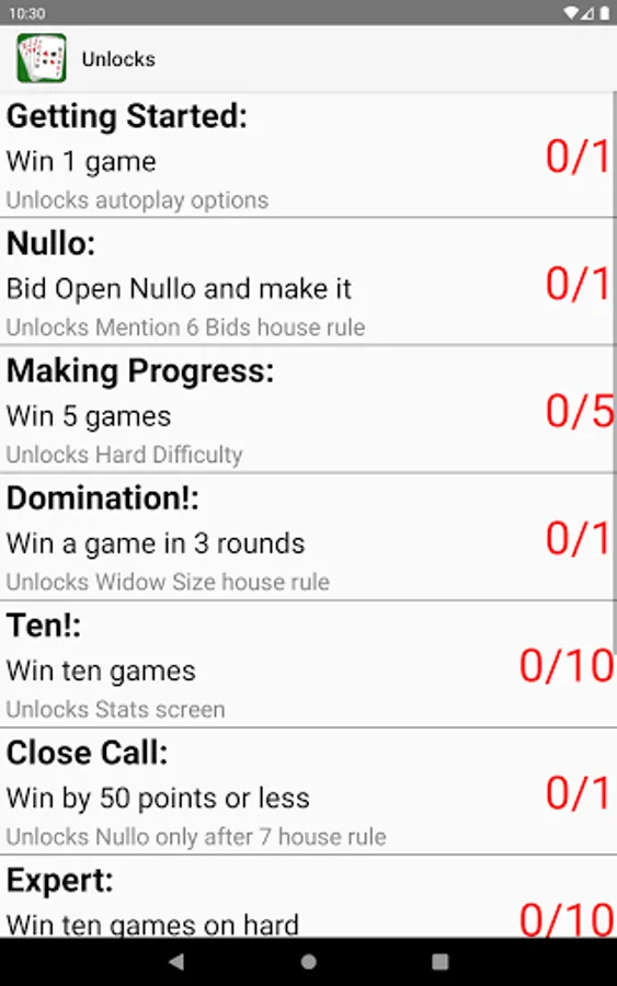 - Detailed description of how to play 500 and tips that popup during the game to help players learn the game