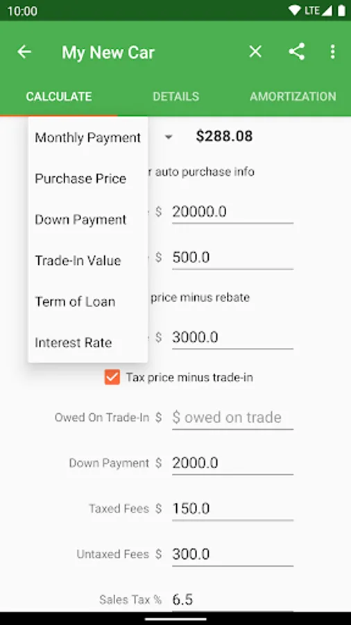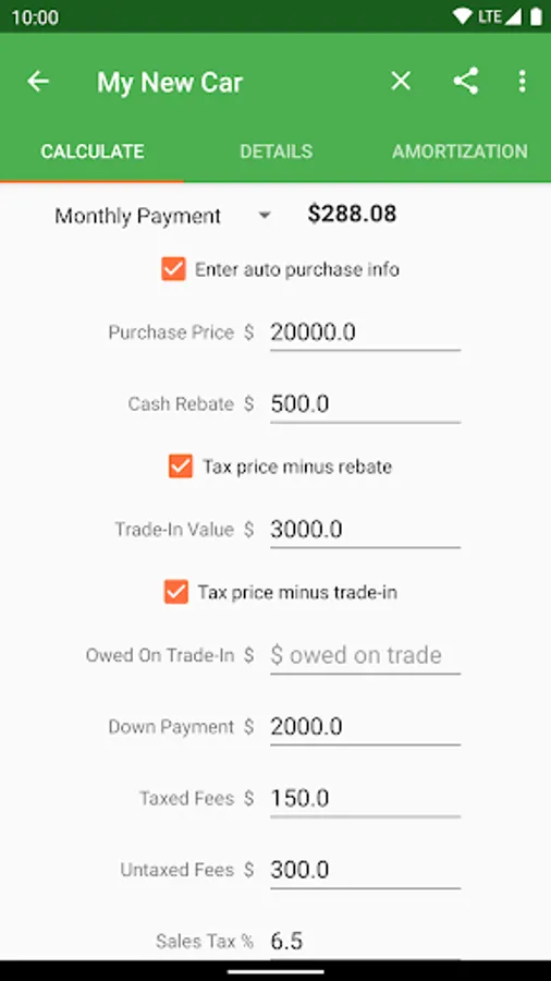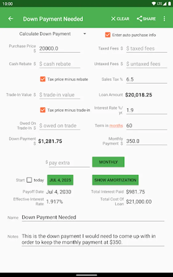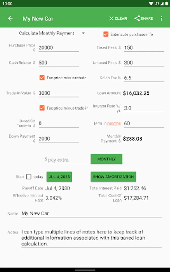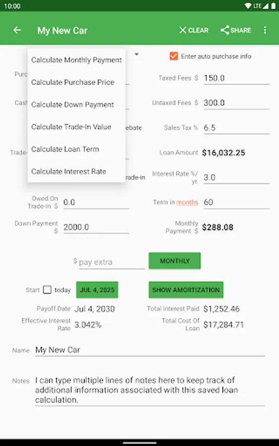 CALCULATES ANY OF THESE AUTO LOAN TERMS: Monthly Payment, Loan Amount, Term of Loan, Annual Interest Rate, Purchase Price of Vehicle, Down Payment, Trade-In Allowance, Payoff Date, Effective Interest Rate, Total Interest Paid, Total Cost of Loan.