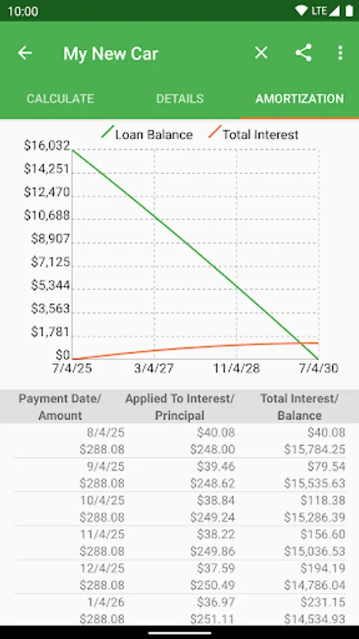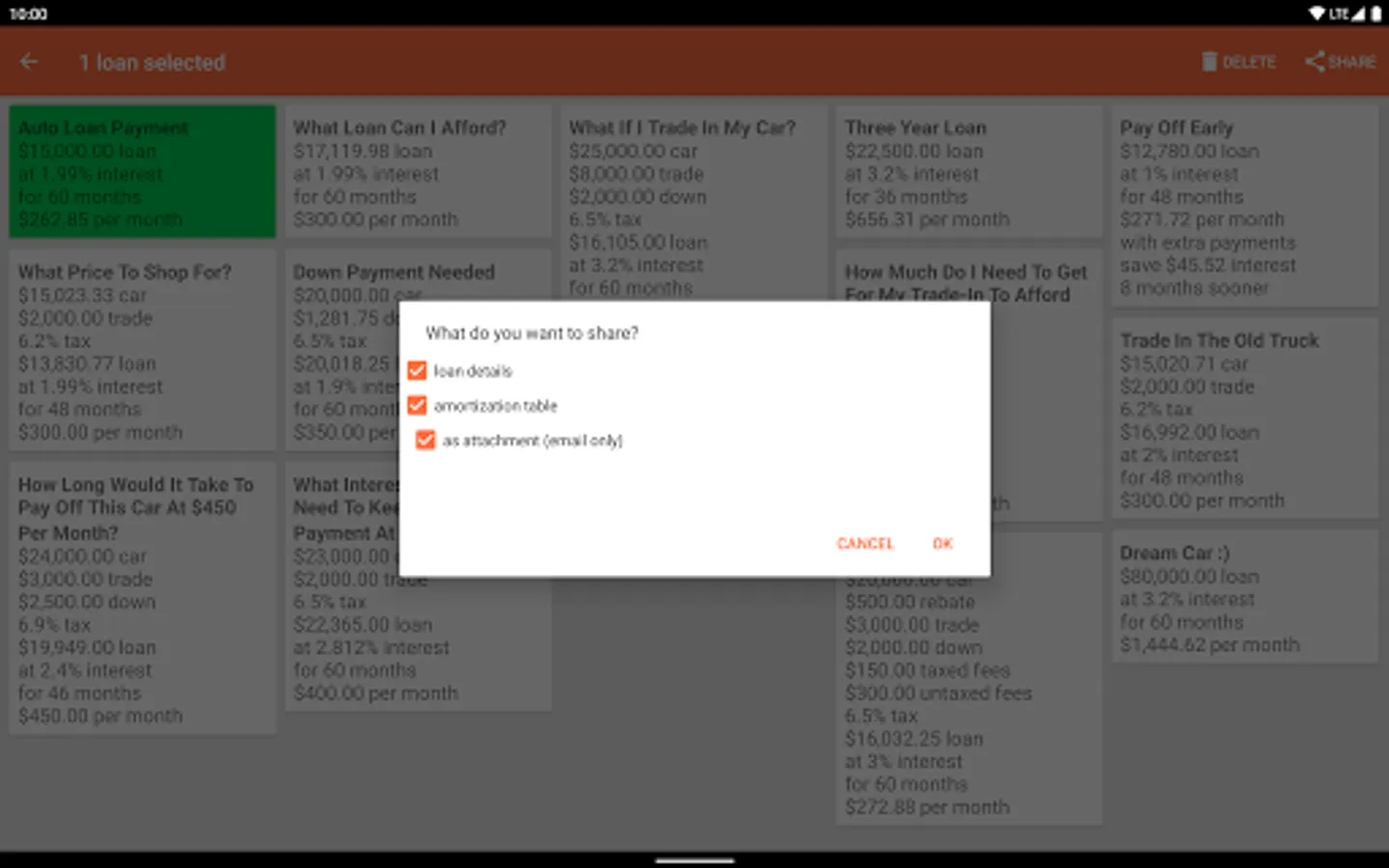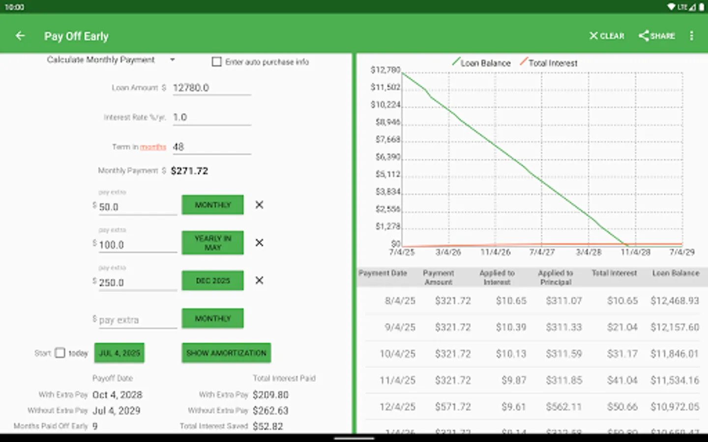 EMAIL OR SHARE: Share the loan calculation details and/or the amortization table over email or any other share target on the Android device. The amortization table can be attached to emails as a comma-separated values file (.csv) for importing into spreadsheets.