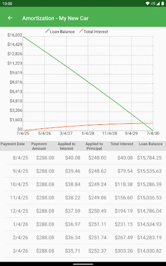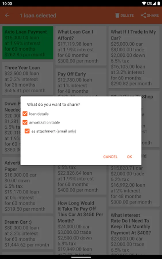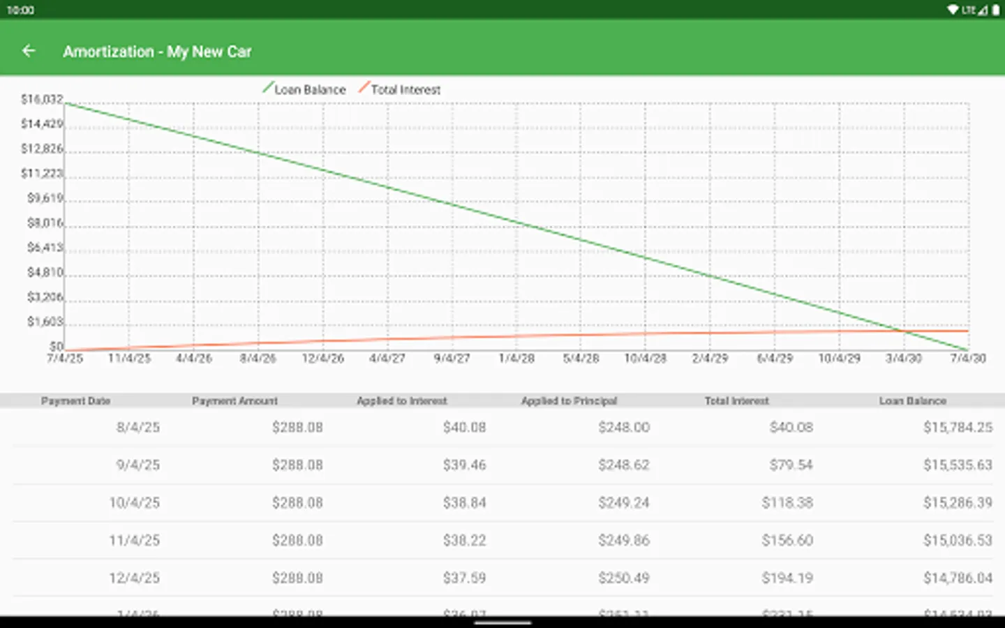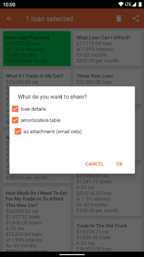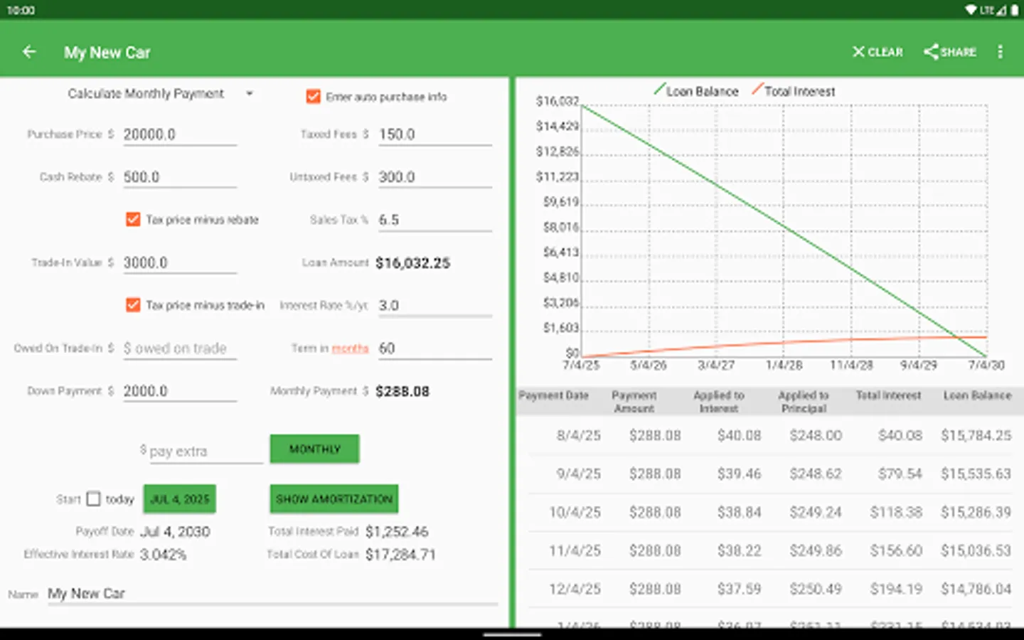 EMAIL OR SHARE: Share the loan calculation details and/or the amortization table over email or any other share target on the Android device. The amortization table can be attached to emails as a comma-separated values file (.csv) for importing into spreadsheets.