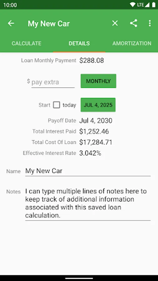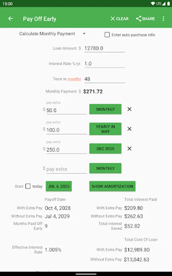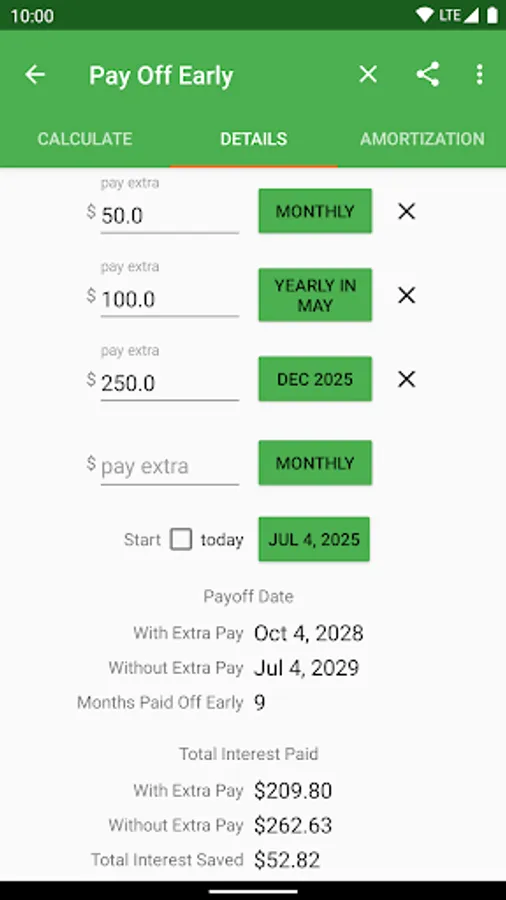 EXTRA PAYMENTS: You can enter as many extra payments as you want with varying frequencies from monthly to annually to one-time payments. See how much interest you would save and how much earlier you would pay off the loan with additional payments.