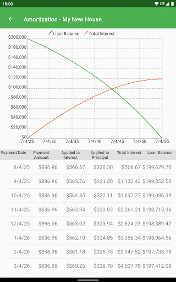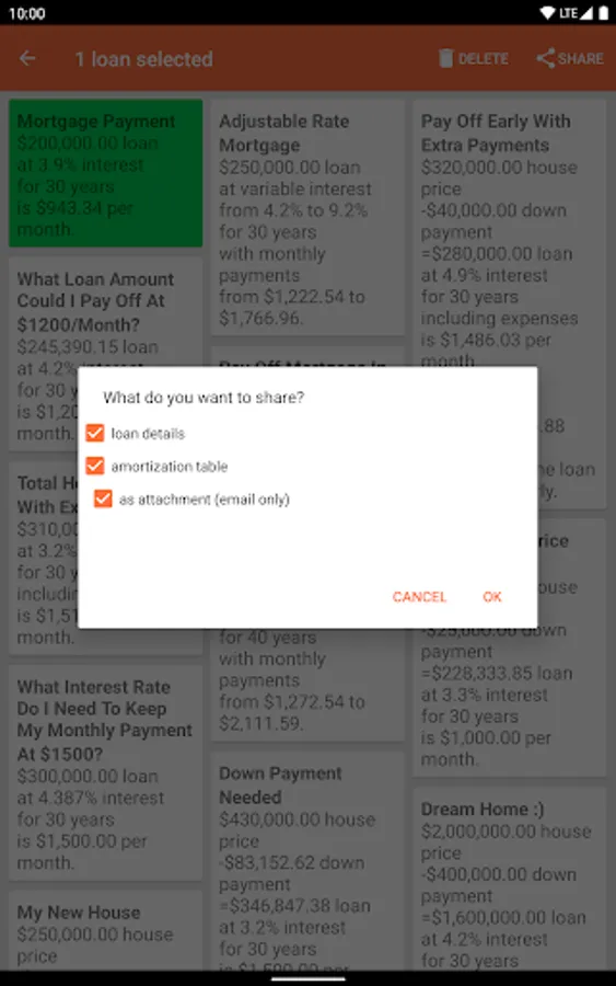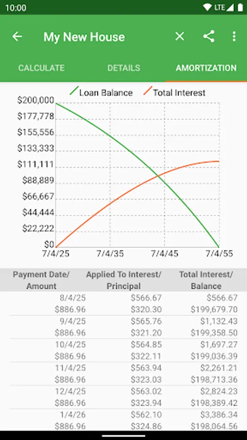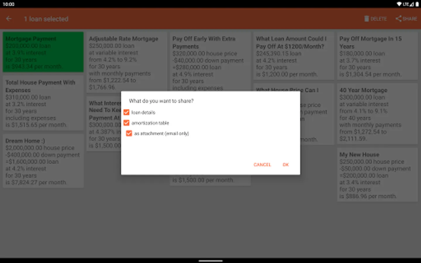 EMAIL OR SHARE: Share the loan calculation details and/or the amortization table over email or any other share target on the Android device. The amortization table can be attached to emails as a comma-separated values file (.csv) for importing into spreadsheets.