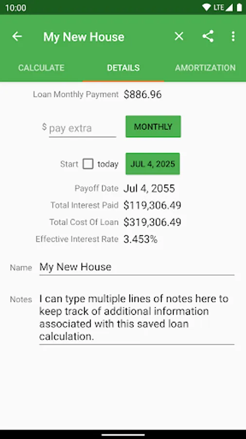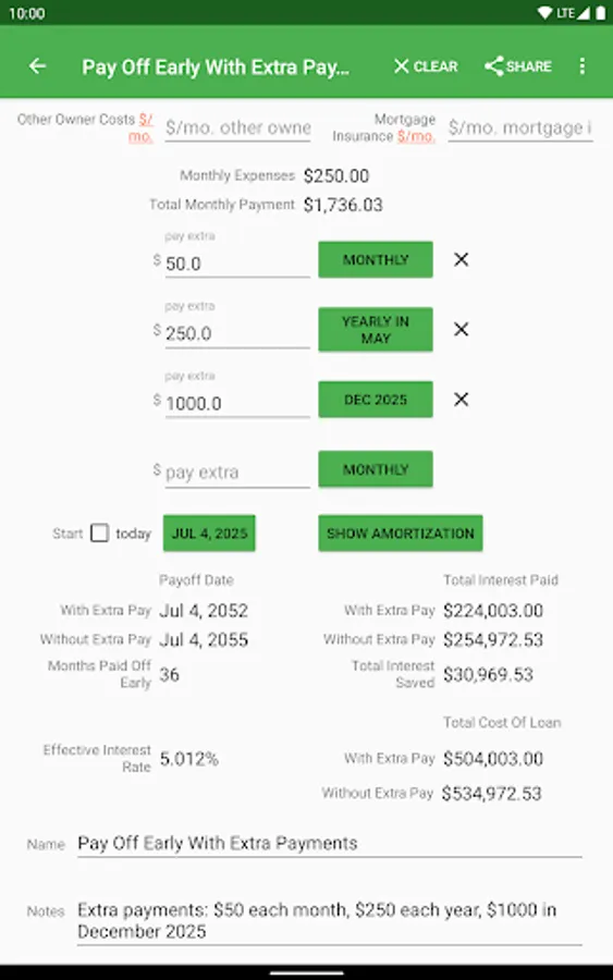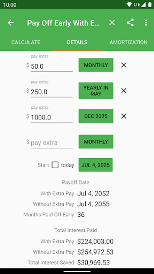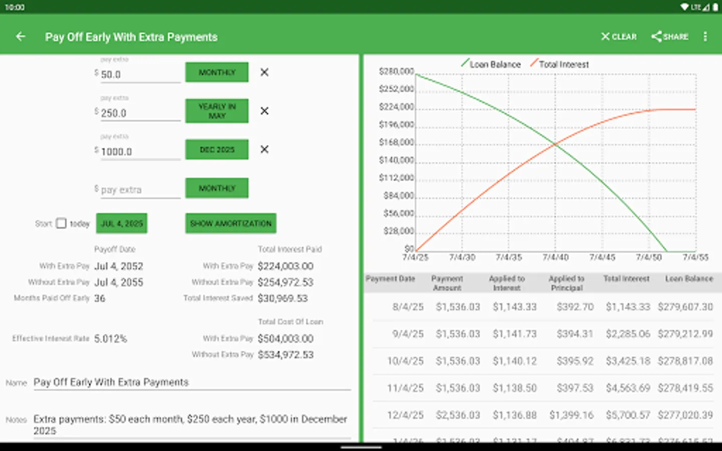 EXTRA PAYMENTS: You can enter as many extra payments as you want with varying frequencies from monthly to annually to one-time payments. See how much interest you would save and how much earlier you would pay off the loan with additional payments.
