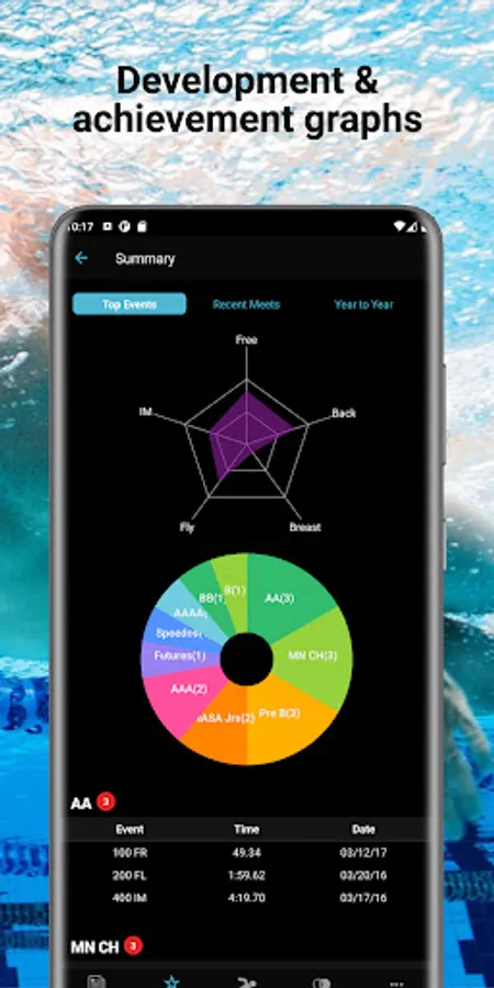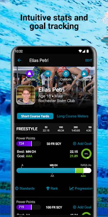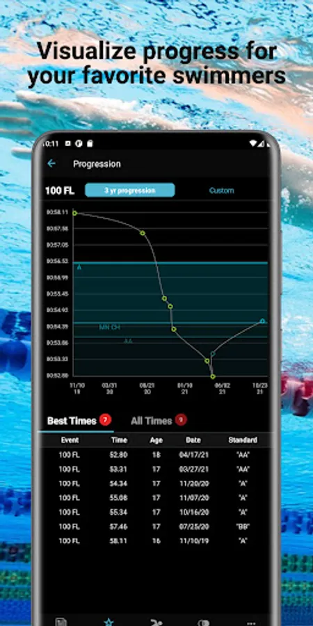 Get the most out of competitive swimming with swimmer progressions, goal tracking, head to head comparisons, live meet results, and latest news right at your fingertips!