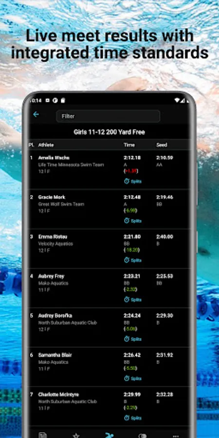 - View live meet results with integrated time standards. Also see when your favorite swimmers are competing in a live meet, and check their results.