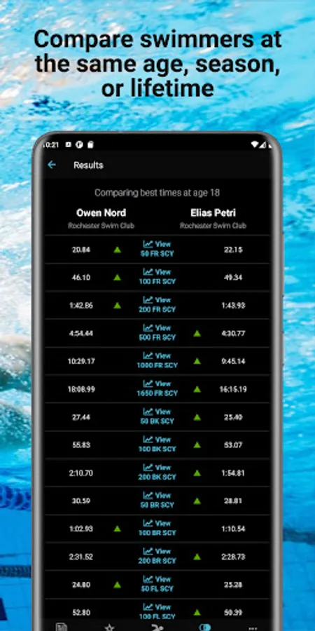 - Want to see how you stack up against your friends? Your rivals? The greatest of all time? Now you can. Compare lifetime bests, season bests, or best times at the same age. Or view a swimmer's progression over the past year. See just how fast the greatest Olympians were at your age.