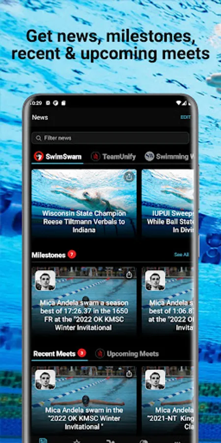 - Never miss a beat: Get recent news from SwimSwam, TeamUnify, and Swimming World, and keep up with your favorite swimmers in your personalized news feed.