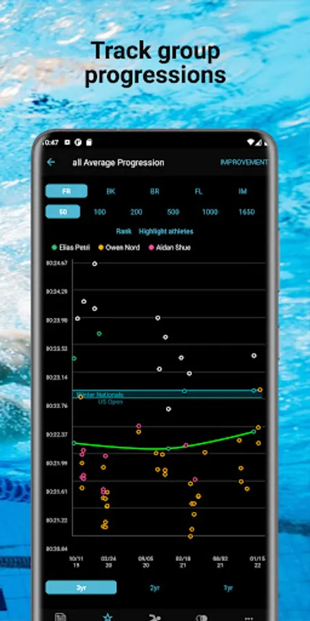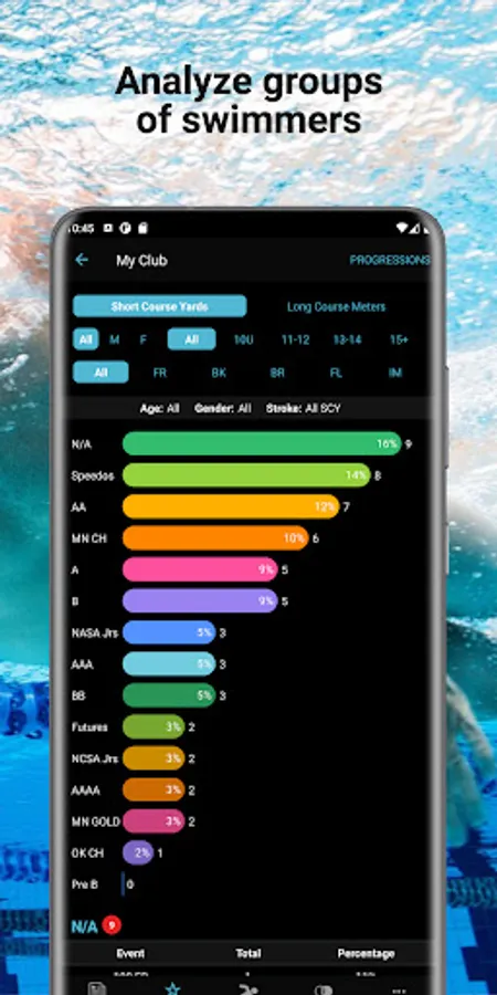 - Team analytics lets you track achievements and average progressions for different groups of swimmers.