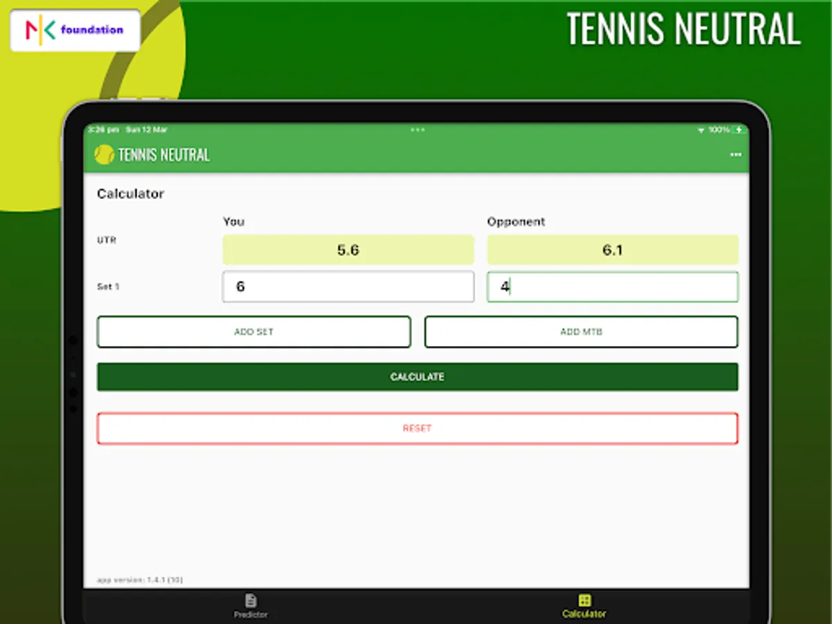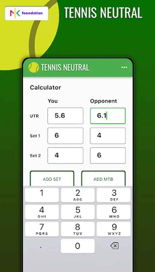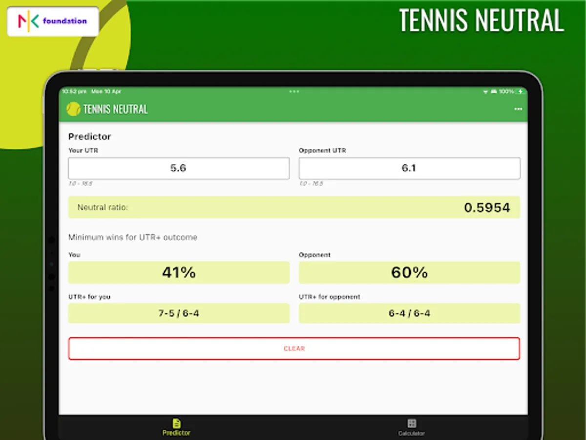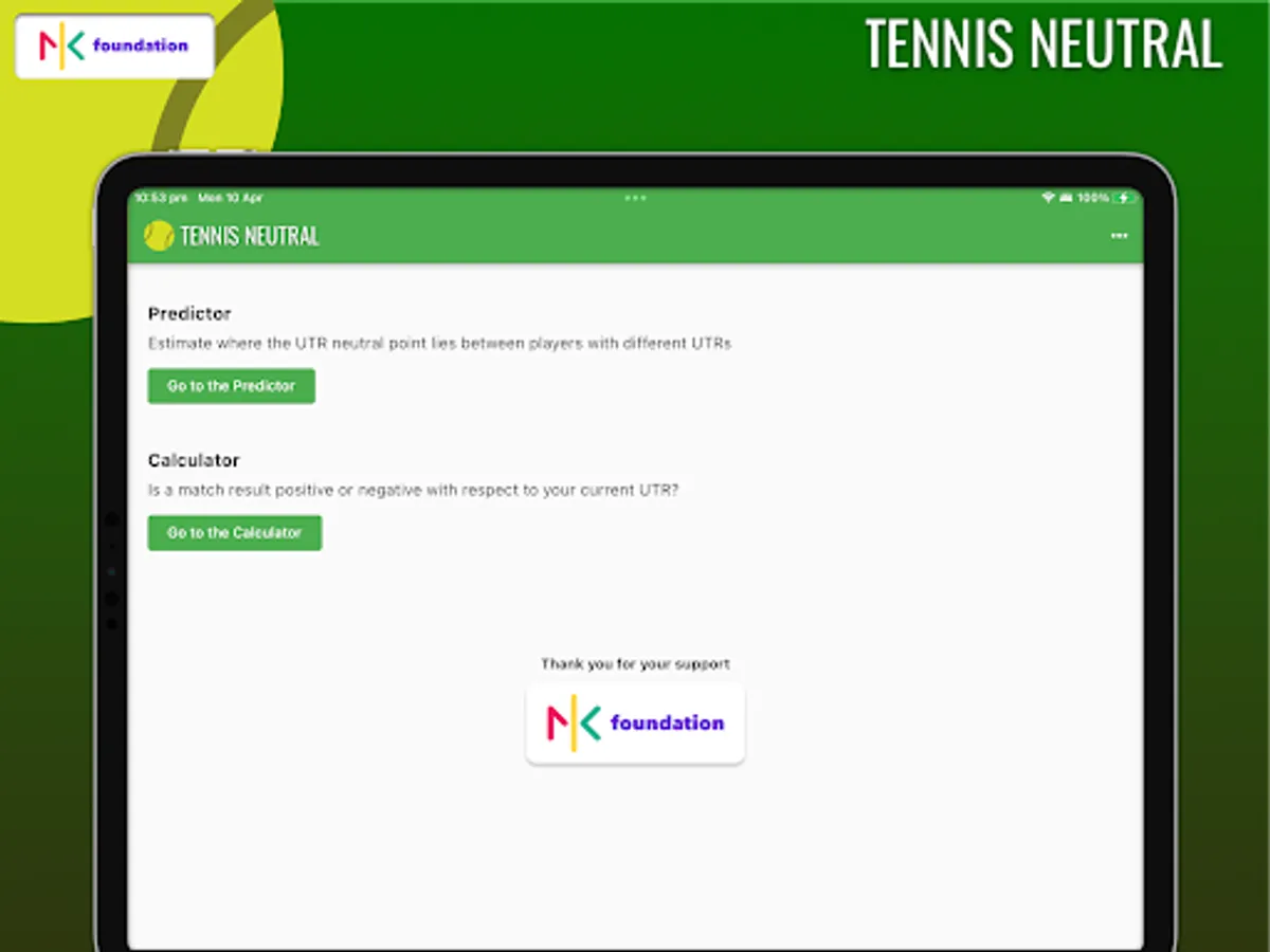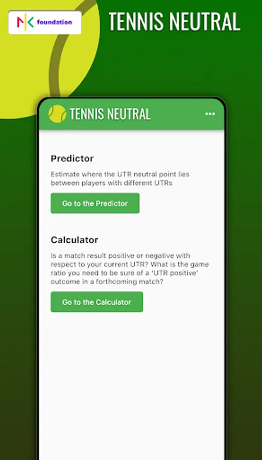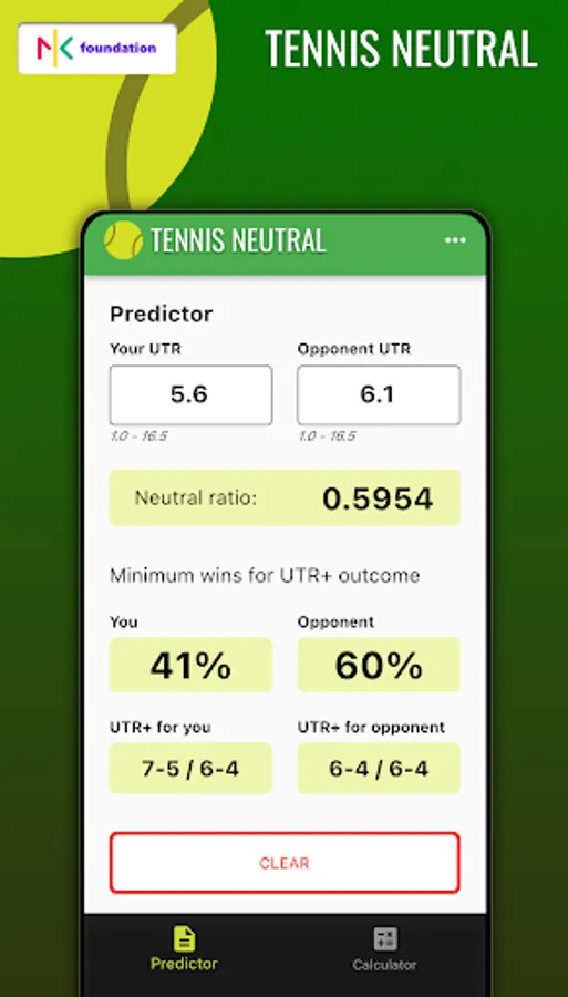 • Enter two UTRs into the app to see the ratio of games that would return a ‘neutral’ UTR result.