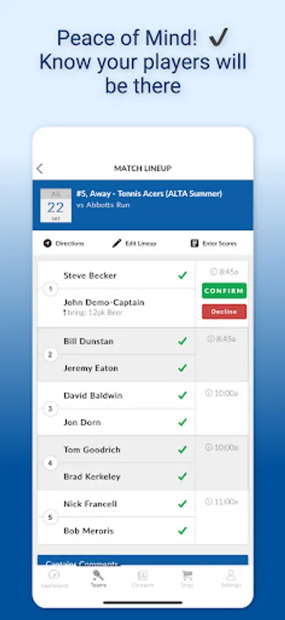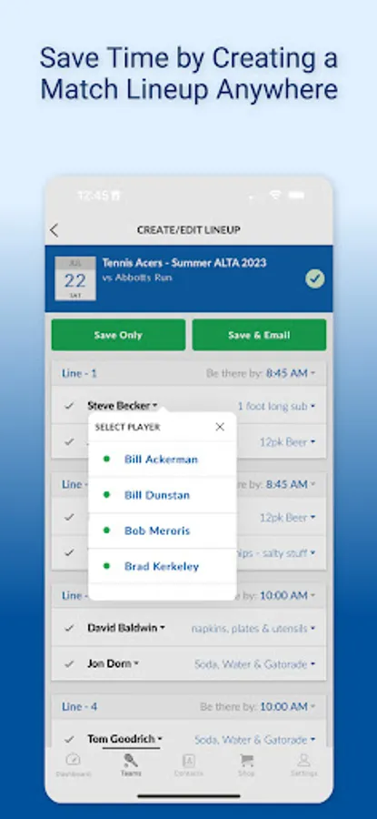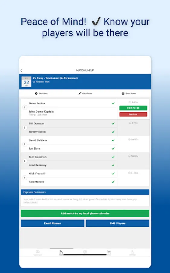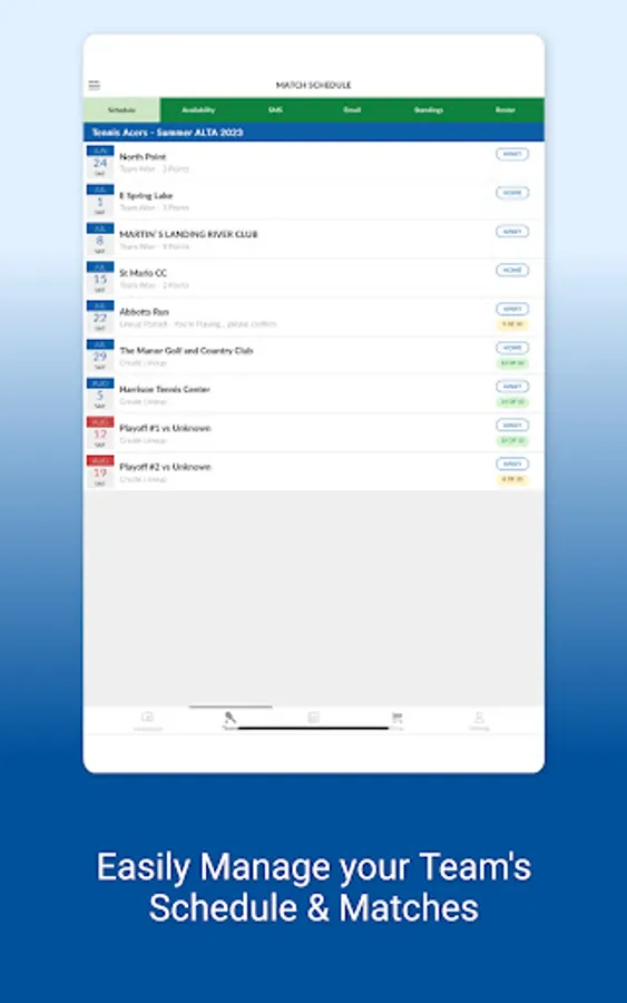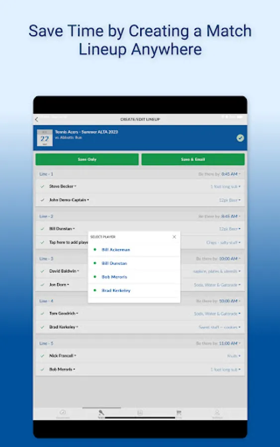 * Create/Edit Match Lineups - create your match lineup through the app quickly and easily. You can select who is playing which match line and also enter what each player should bring. Need to change the lineup, you can do that as well.