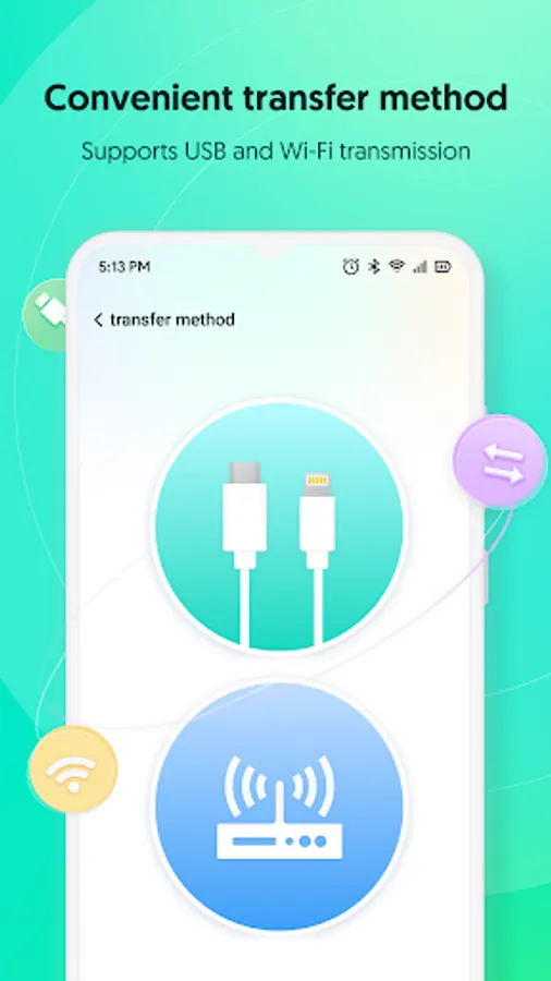* Transfer via OTG or Wi-Fi. Data such as text messages, audio messages, photos, videos, emojis, stickers, and other data can be immediately transferred to an iPhone via an OTG data cable or to an Android via Wi-Fi.