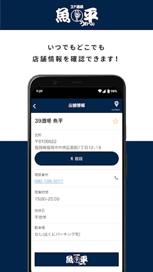 This is the official app of "39 Sakaba Uohira", a sushi bar that loves fish and sake located in Yakuin, Chuo-ku, Fukuoka.