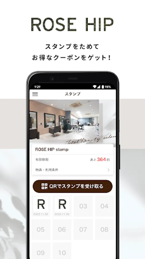 The official app of "ROSE HIP" delivers information such as stamp cards and store events.