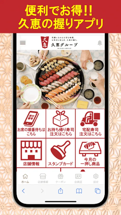 This is the official app of conveyor belt sushi and home delivery sushi "Kuebisu Co., Ltd."