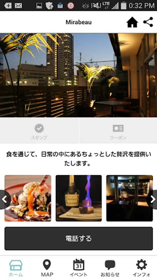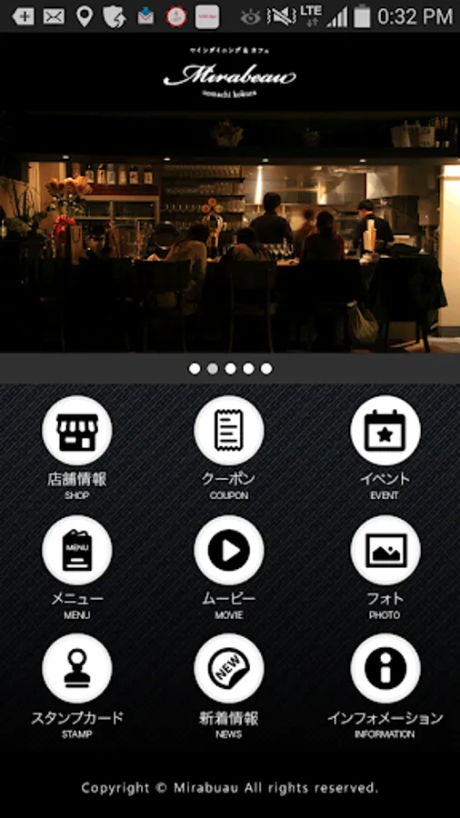 Shop information / access / MAP (map) / menu introduction / Photo / coupon delivery / news / stamp card / push notification / settings
