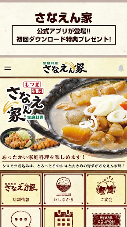 The "Sanaenchi" official app delivers the latest information on each store and discount coupons limited to the app at any time.