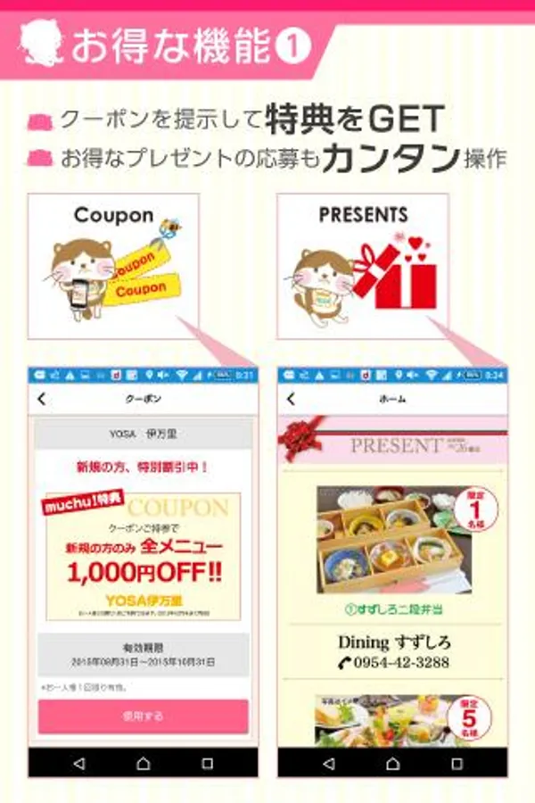 (2)メンバーズショップ(muchuに掲載されているお店の情報がアプリでもご覧になれます、またアプリのみのお得情報も配信いたします)