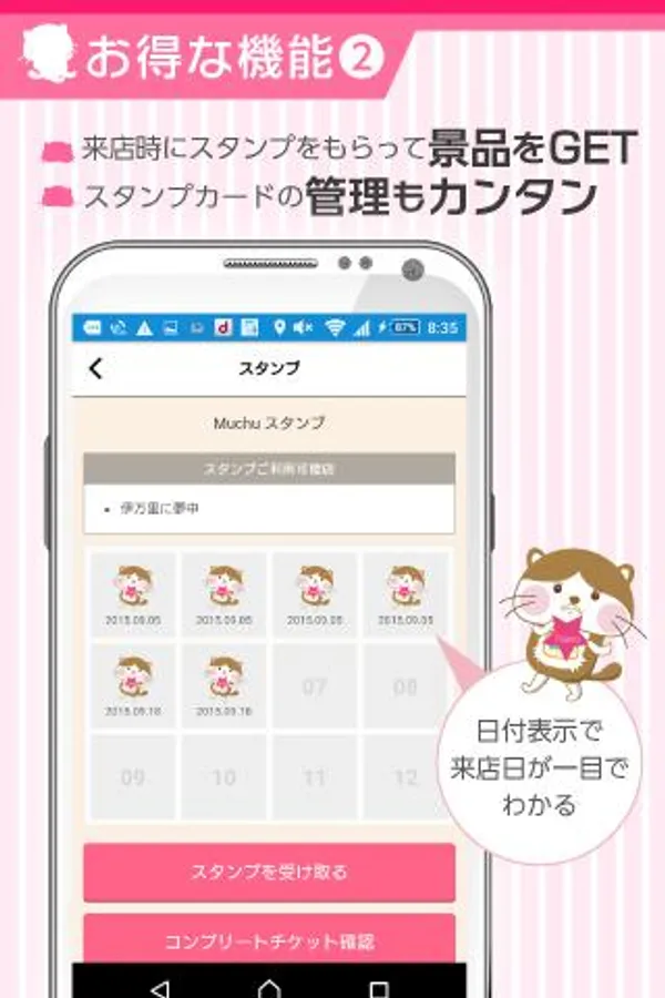 (5)来店スタンプ(muchu掲載店でmuchuスタンプが来店時に貰えて、スタンプが貯まれば素敵な景品が貰えます