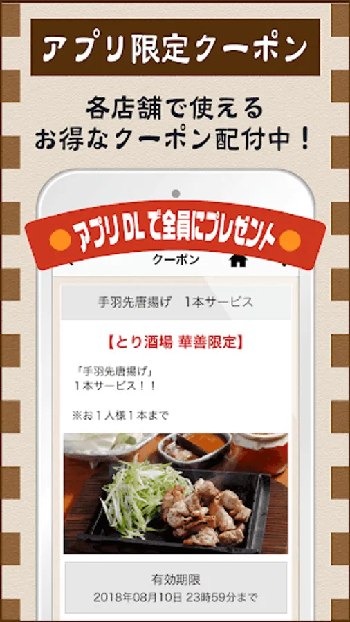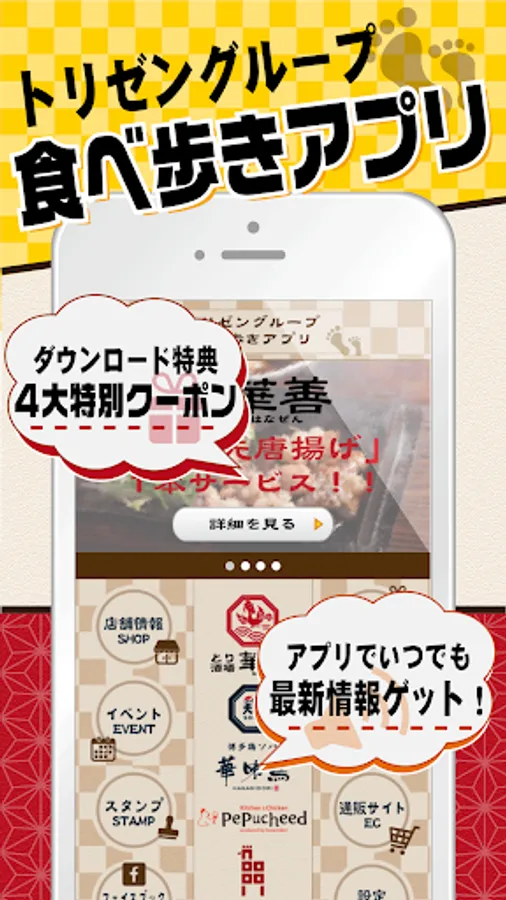 「トリゼングループ食べ歩きアプリ」では、「とり酒場 華善」「Pepucheed」「博多鶏ソバ」「カドノカシーワ」の最新情報やアプリ限定のお得なクーポンを随時配信しています。