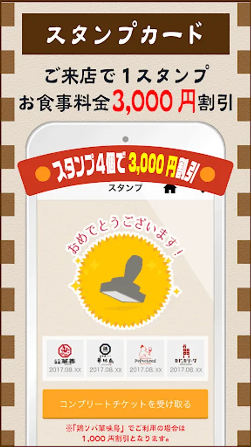 スタンプが4つ貯まると次回ご来店時に飲食料金から3,000円引き致します。