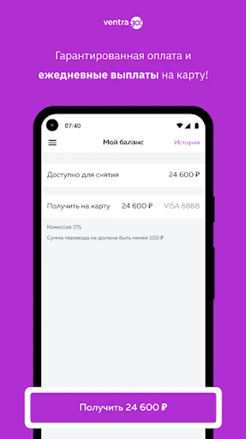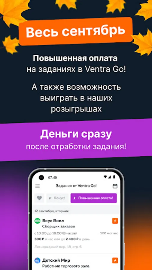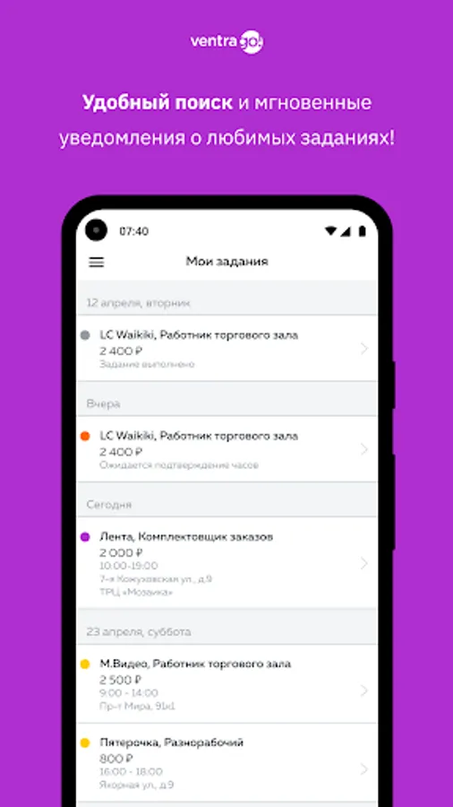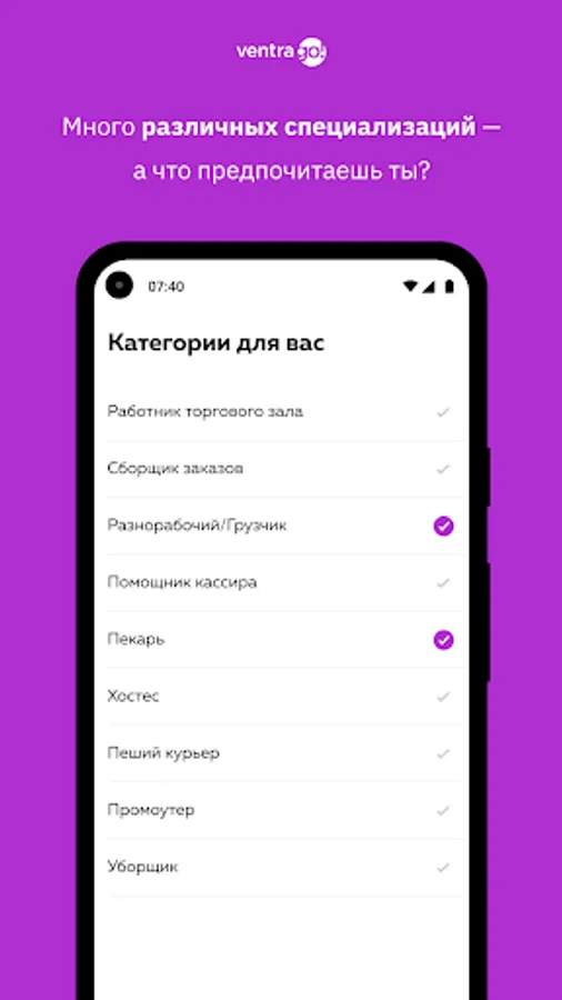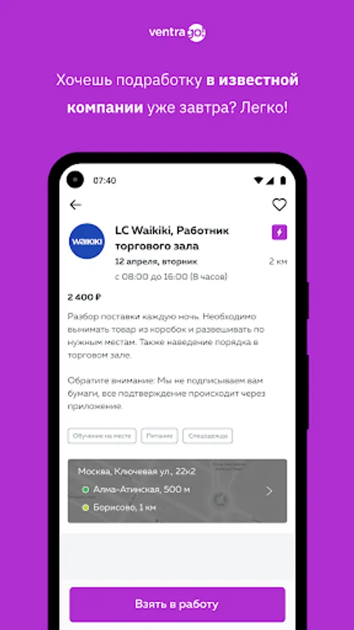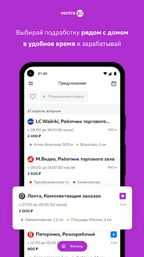 — В приложении найдутся варианты временной работы - без опыта, посменно. Смотрите самые разные предложения и зарабатывайте больше с Ventra Go!