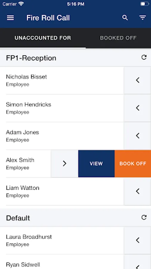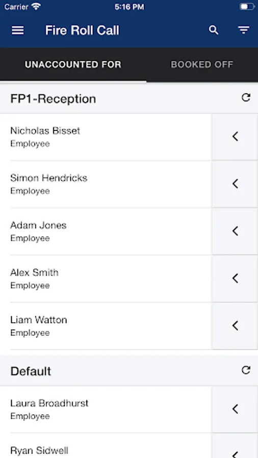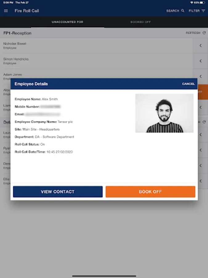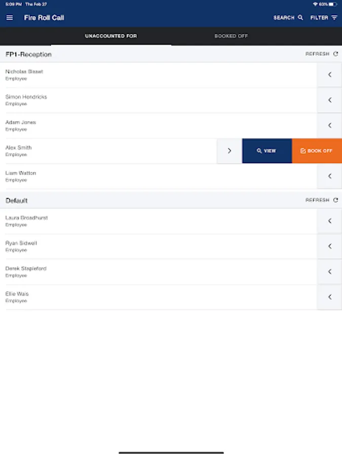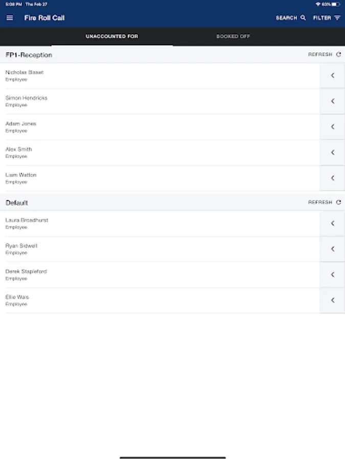 • the app displays a refreshable list of employees, within a selected fire point, who are booked ON site for fire roll call purposes.