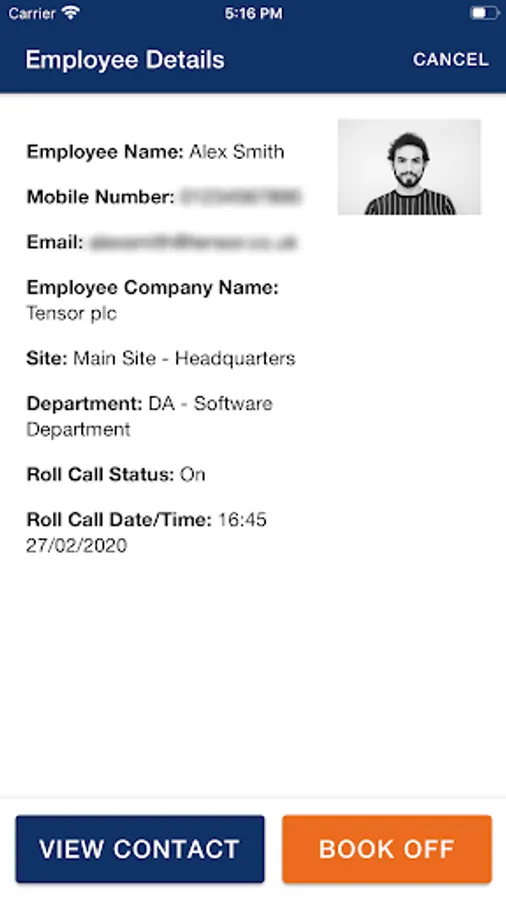• full contact details, including name, telephone numbers, photographic image and the time and status of the last site booking, are available for each person on or off site.