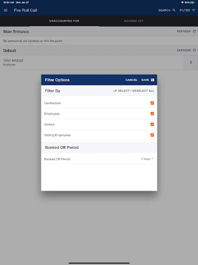 • lists of on or off site personnel can be filtered by type; employee, visitor, contractor or visiting employee.