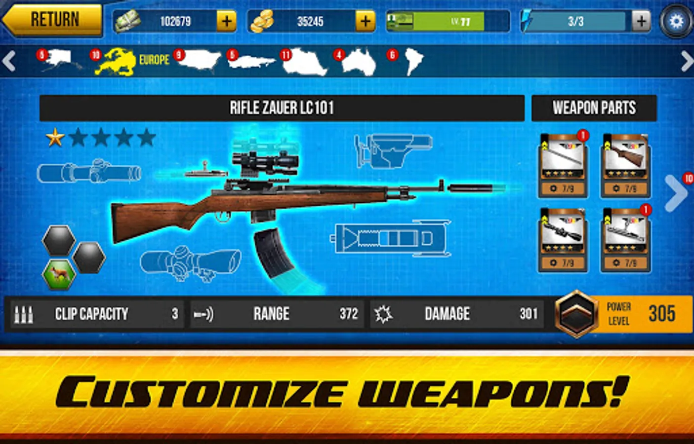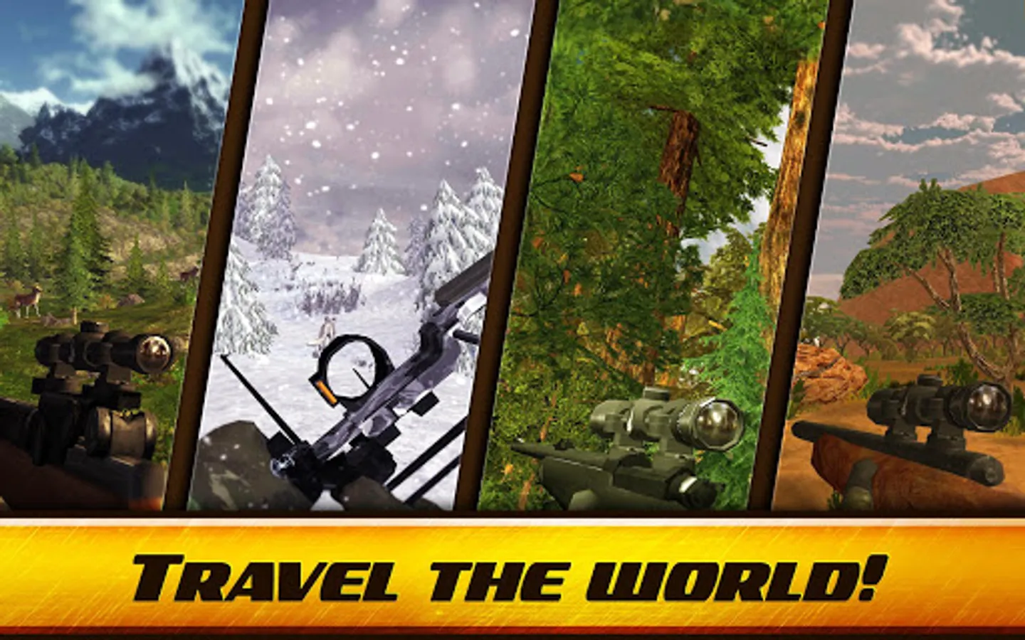Travel to realistic hunting locations across all continents and hunt real animals that naturally inhibit those territories. Hunt a deer or a bear in Yellowstone Park (USA), pursue a rhinoceros in the Nile (Egypt), entrap a walrus in the Arctic Ocean (Russia), target a dingo in the Australian Outback and much more! Go hunting to the most exotic spots, right from your mobile device. Deer shooting games just went global!