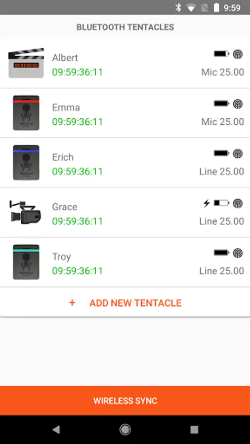 The Tentacle Sync E works without any cable. Just switch on Bluetooth and follow the instructions of the App. You can monitor all running Sync E's in your reach including their: