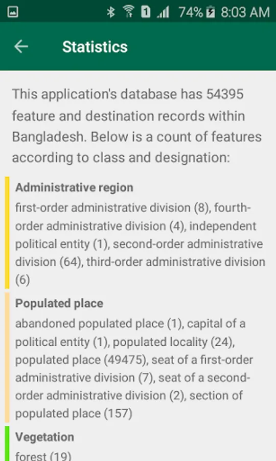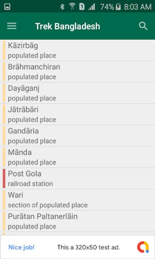 Trek Bangladesh application is a hiker's guide to geographic points of interest within Bangladesh. You will be able to search for, locate, and maybe even visit, 54395 interesting spots and features within the country.