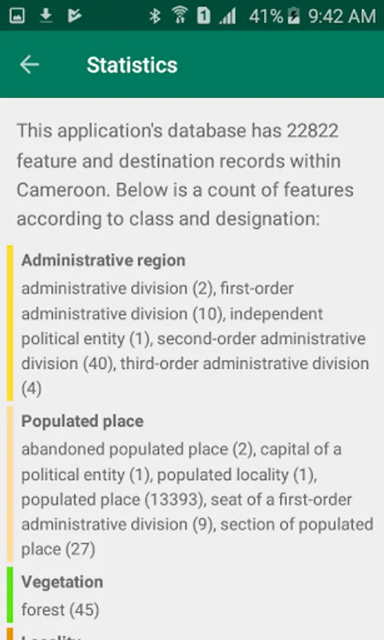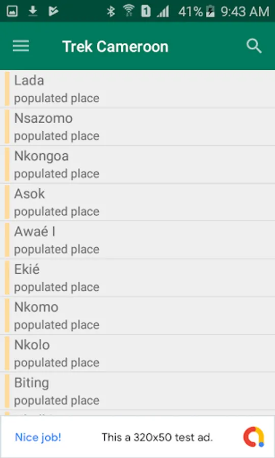 Trek Cameroon application is a hiker's guide to geographic points of interest within Cameroon. You will be able to search for, locate, and maybe even visit, 22822 interesting spots and features within the country.