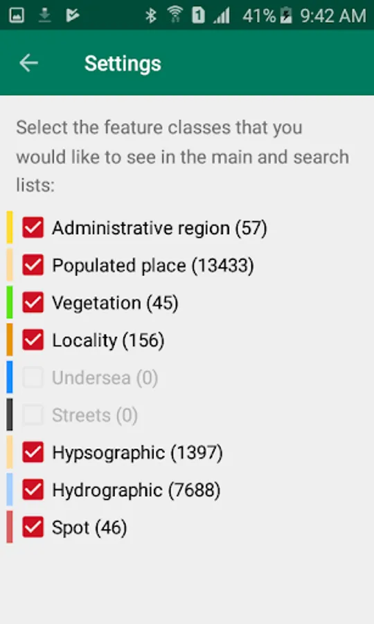 Gorges, peninsulas, slopes, forest reserves, ridges, pools, dams, bights, deltas, anabranches, banks, depressions, streams, estuaries, wells, crater lakes, marshes, localities, hospitals, and many more designations and classes.