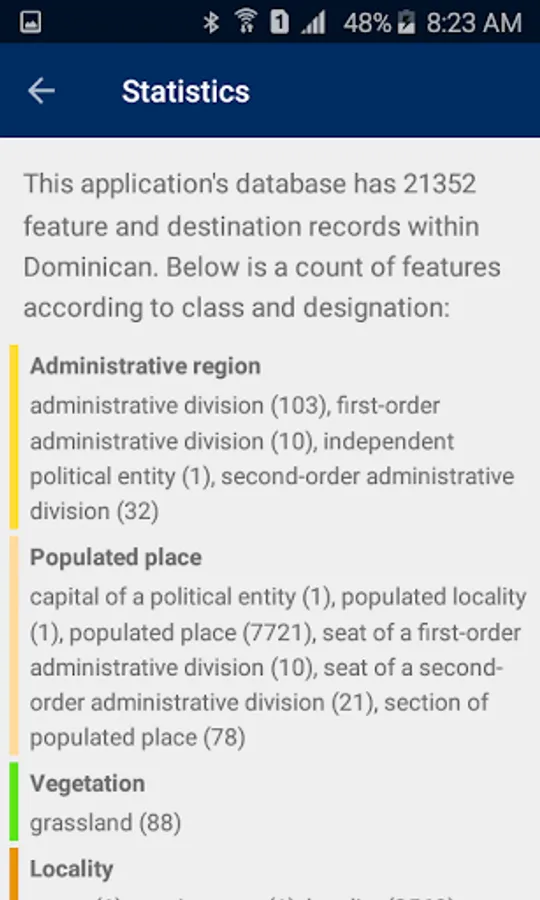 Trek Dominican application is a hiker's guide to geographic points of interest within Dominican. You will be able to search for, locate, and maybe even visit, 21352 interesting spots and features within the country.