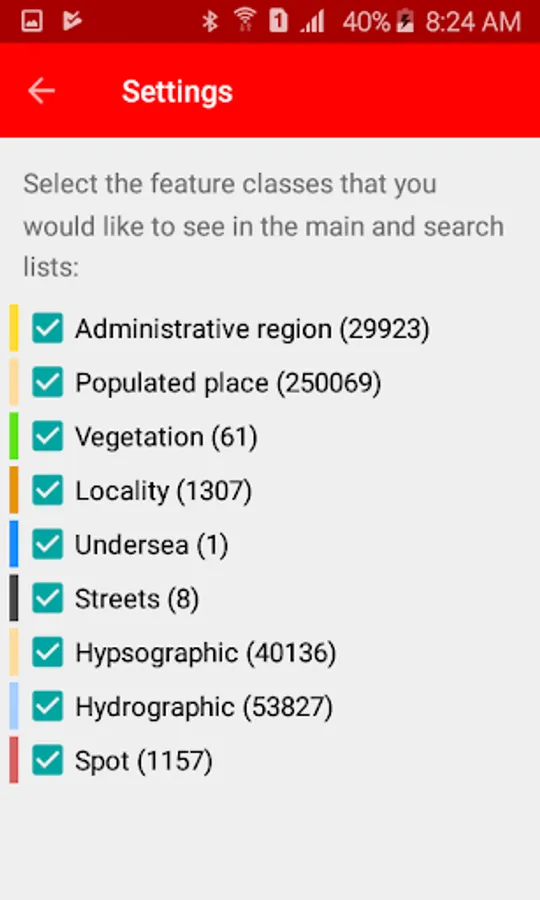 Road junctions, trails, resorts, landings, headwaters, golf courses, bridges, orchards, oil wells, distributaries, calderas, storehouses, populated places, fishponds, reservoirs, ferries, seas, gorges, farms, and many more designations and classes.