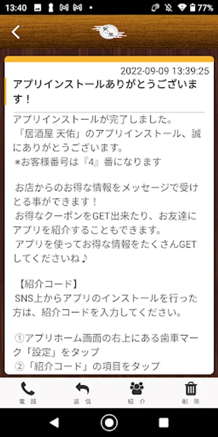 Izakaya Tenyu's app can be introduced to your friends via SNS.