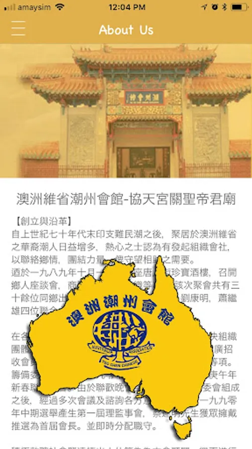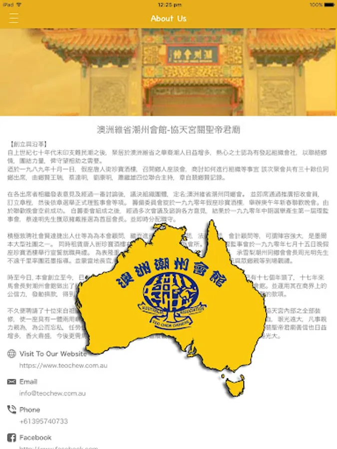 This app is to provide information for "The Teo Chew Chinese Association of Vic. Inc." in Australia", teochew.com.au, to public users, including latest news and members directory.