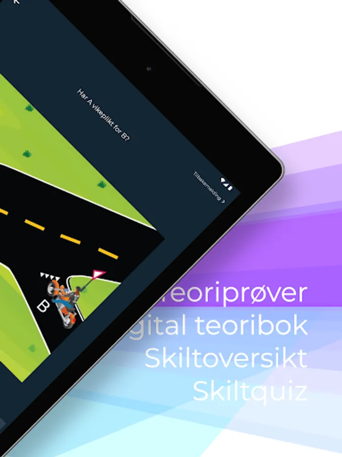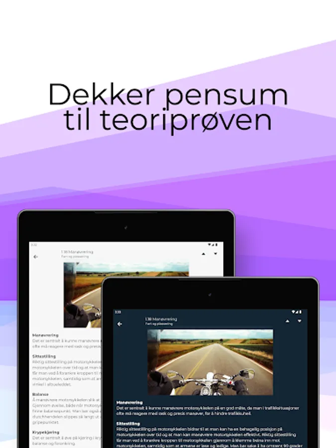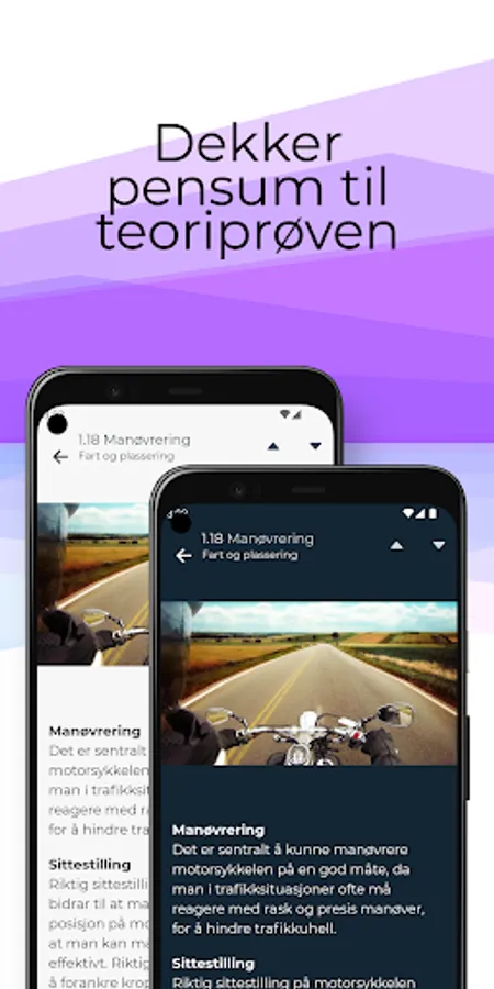 Innholdet i appen gir deg kunnskapen du trenger for å bestå teoriprøven for motorsykkel - klasse A, A1 og A2 - hos Statens vegvesen.