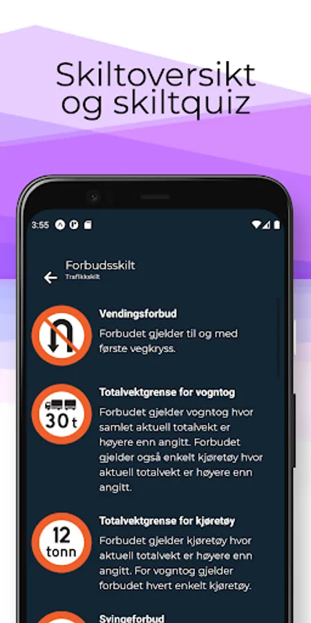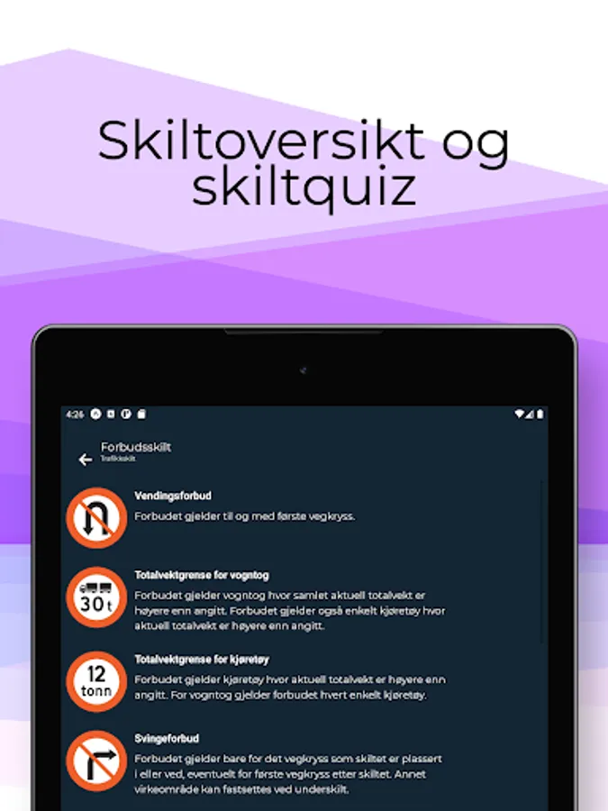 Du lærer hva de ulike trafikkskiltene betyr ved å studere skiltoversikt og ved å gjennomføre skiltquiz.