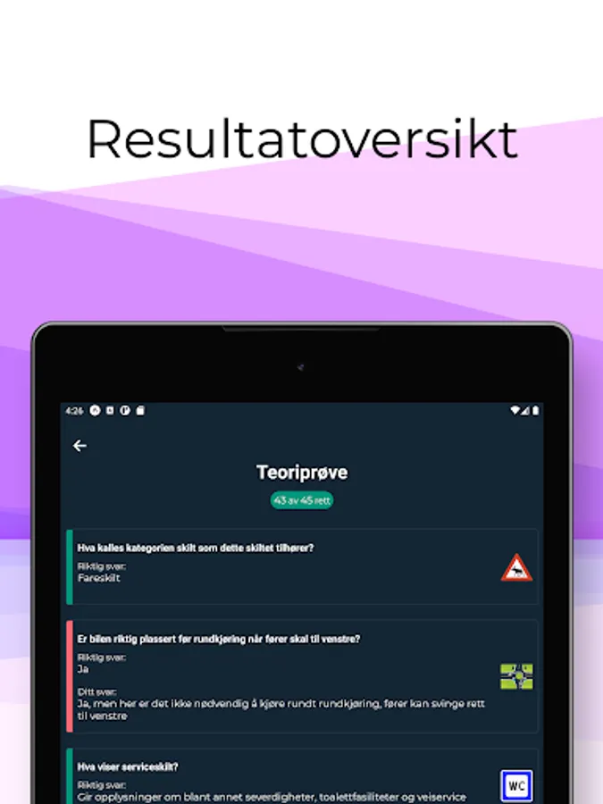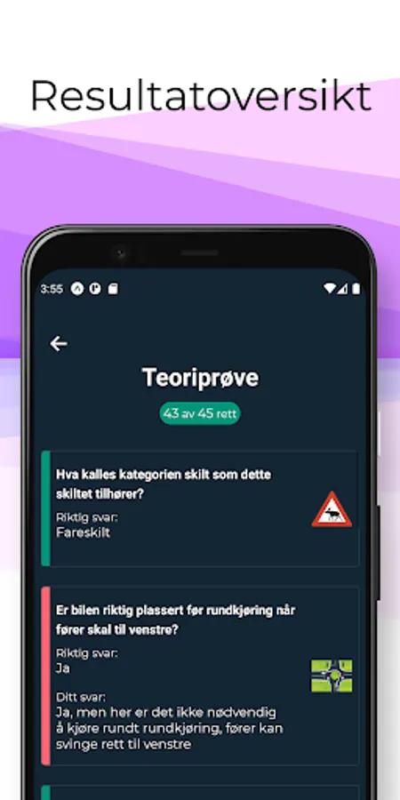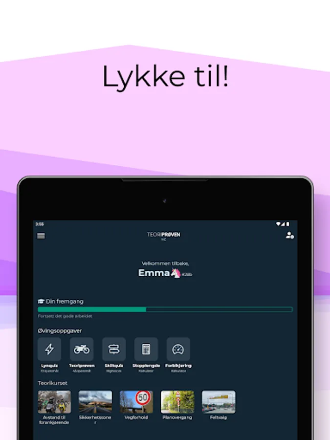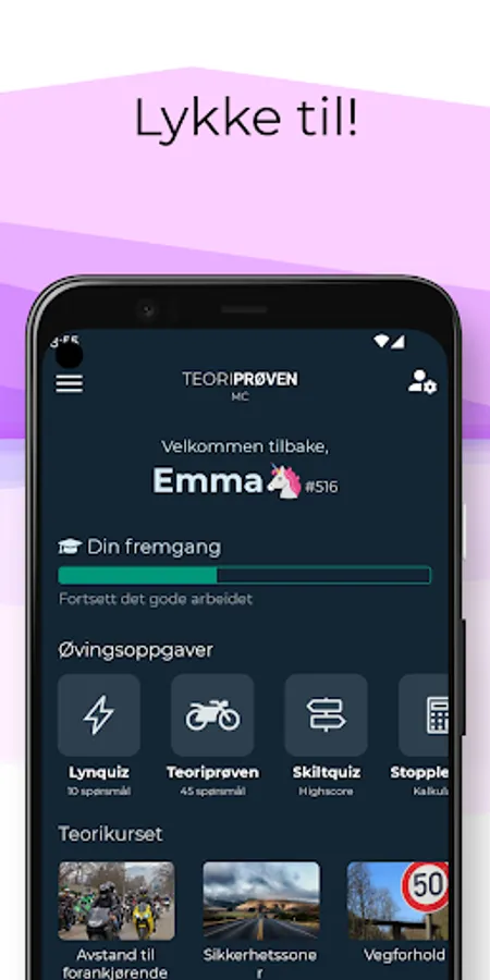 I appen følger du din progresjon og kan se når du er godt nok forberedt til å bestå den offisielle teoriprøven.