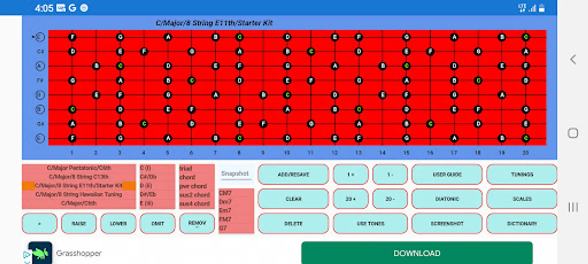 Welcome to the Chord and Scale Finder! This application was designed to assist players of steel guitar who need to navigate unusual tunings but in the course of designing it and talking with musicians it became apparent that it could serve as a Swiss Army Knife for any stringed instrument. Interested in playing jazz on a bouzouki or oud using the harmonic minor scale or playing heavy metal on an 8 stringed guitar in some obscure tuning known only to you? Then this is the product for you!! Alternatively if you are just starting out on the guitar, ukulele, bass, dobro or any other stringed instrument you can create small (or not so small) libraries of screenshots featuring all of your "go to" chords and scales using notes and/or chord and scale tones for quick reference. Detailed information and examples on how to use the product can be found on the 69th Street Band's website (https://69thstreetband.com/the-chord-and-scale-finder/). If you have specific questions address them to csfinder@69thstreetband.com.