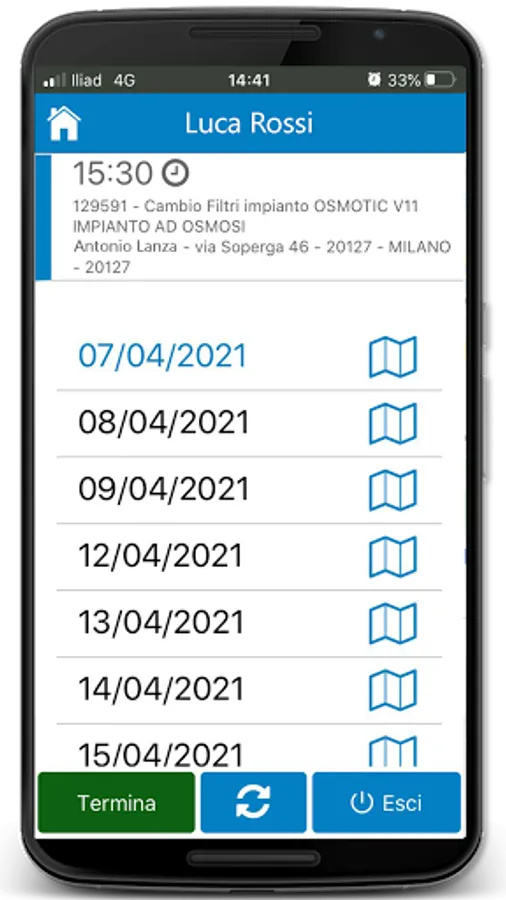 The user registers and, from that moment, can select their planned interventions and stamp the start and end of the work.