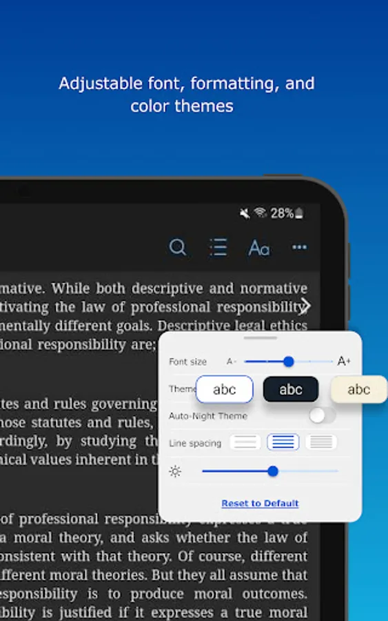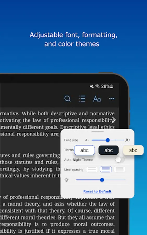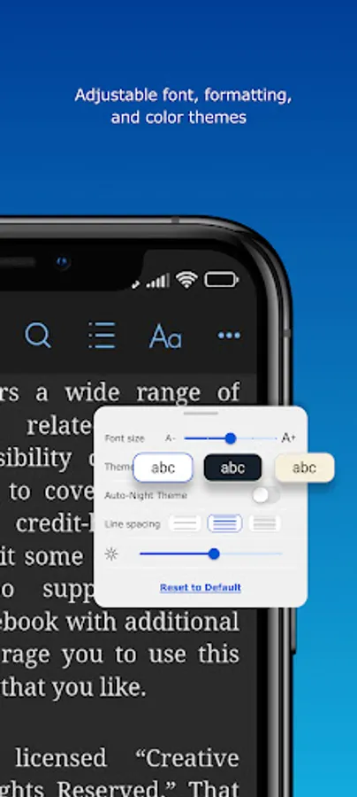 ∙ Personalize font size, color theme, line spacing, and more for more comfortable reading.