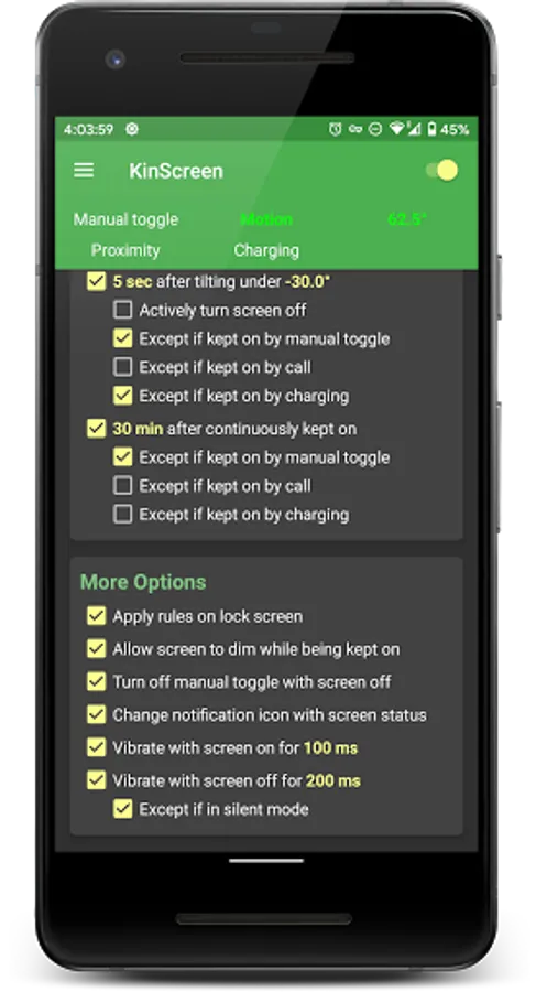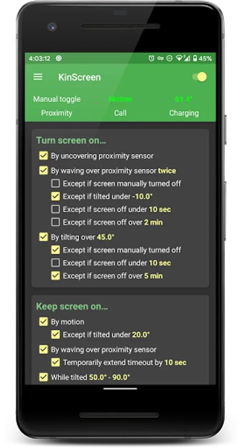 Save the wear and tear on your power button by using gestures to turn the screen on. You can turn the screen on via the proximity sensor or by lifting the device up. Uncovering the proximity sensor lets you pull your phone out of your pocket and have the screen turn on automatically. Waving over the sensor works great when your hands are dirty! You may also set a tilt angle that turns the screen on when the phone is lifted up (tilt to wake).