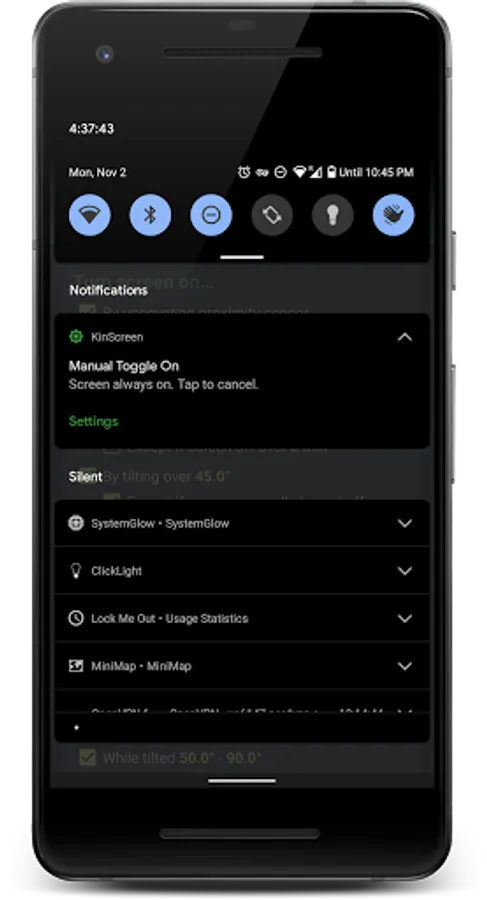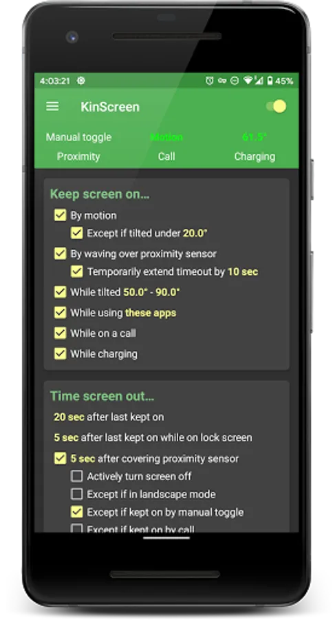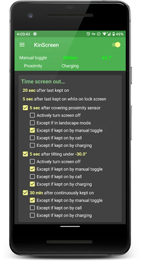 You can choose the screen timeout when there are no keep-on functions actively keeping the screen on. If the screen isn't being kept on, it should time out quickly to save battery power. The screen can turn off even quicker when the proximity sensor is covered (in-pocket or face down), or when the device is pointed down. You can also set a separate timeout for the lock screen. KinScreen will not turn the screen off when other apps are keeping the screen on, unless you have selected to actively turn the screen off.
