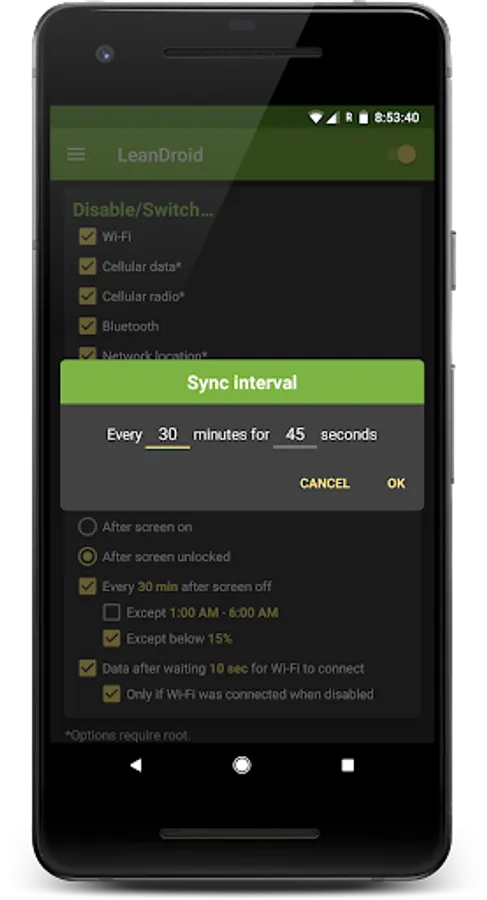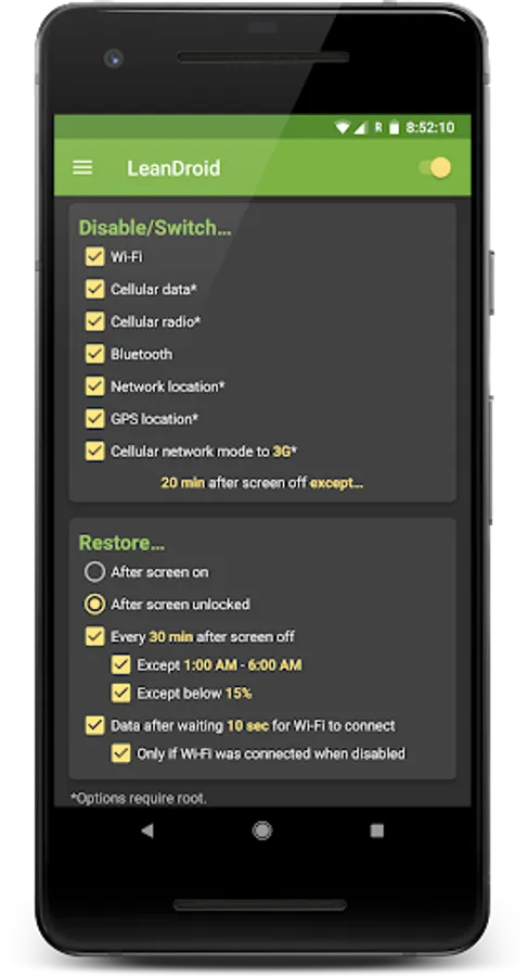 LeanDroid can automatically disable Wi-Fi, cellular data*, cellular radios*, Bluetooth, and location* (networks and GPS). It can also switch cellular network types* (ex. 4G to 2G). It will do this after the screen turns off to conserve battery power and lower data usage when you aren't using your phone.